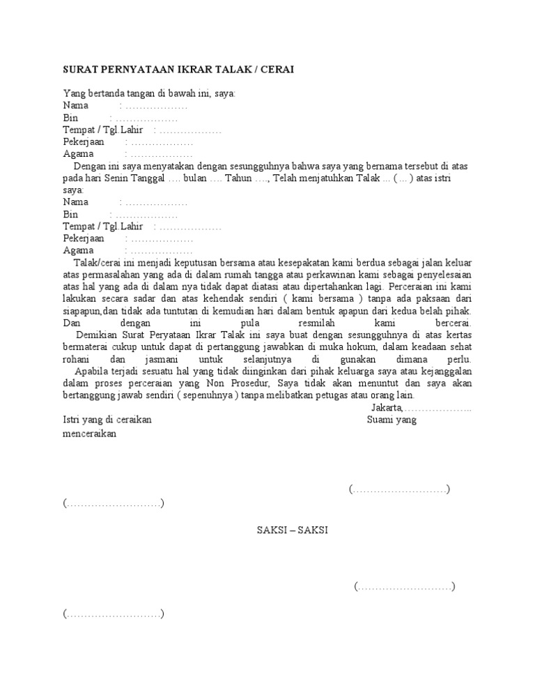 Surat Pernyataan Ikrar Talak Docx Document from static.fdokumen.com Check spelling or type a new query. We did not find results for: Maybe you would like to learn more about one of these?